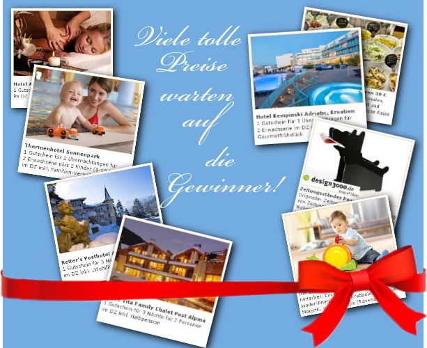 Reichen Sie jetzt Ihr schönstes Babyfoto ein und gewinnen Sie mit etwas Glück tolle Preise! Auf die Teilnehmer unseres diesjährigen Fotowettbewerbs warten auf 40 GewinnerInnen schöne Preise im Gesamtwert von über 10.000 Euro. Nehmen Sie jetzt am großen Fotowettbewerb von EnjoyLiving teil und reichen Sie ein oder mehrere Fotos Ihres Babys oder Kleinkinds ein. Auf die TeilnehmerInnen unseres diesjährigen Fotowettbewerbs "EnjoyLiving sucht das süsseste Weihnachstengerl" warten wieder viele schöne Preise im Gesamtwert von über 10.000 Euro. Die Aktion läuft vom 21. November bis 31.Dezember 2011. Alle Einreichungen werden in unserer Online-Bildergalerie auf www.enjoyliving.at präsentiert. Die schnellsten TeilnehmerInnen werden belohnt Unter den ersten 50 Einreichungen verlosen wir 6 weihnachtliche Kinderbücher vom ArsEdition Verlag. Die Top 6 Siegerfotos - ermittelt durch unsere LeserInnen-Jury Per Voting durch unsere SeitenbesucherInnen werden die 6 süssesten Weihnachstengerl-Fotos als Sieger gekürt: jene 6 TeilnehmerInnen, die die meisten Votingstimmen erhalten, erwarten mit den Plätzen 1 bis 6 tolle Urlaubsgutscheine. Gleiche Chance für alle - tolle Preise werden verlost Aber damit auch jene, die nicht so viele Freunde, Bekannte und Verwandte zum Mitvoten motivieren können, eine Chance haben, verlosen wir unter allen Teilnehmern jede Menge Sachpreise aber auch 5 tolle Urlaubsreisen! Mitmachen zahlt sich also jedenfalls aus! Kommentare